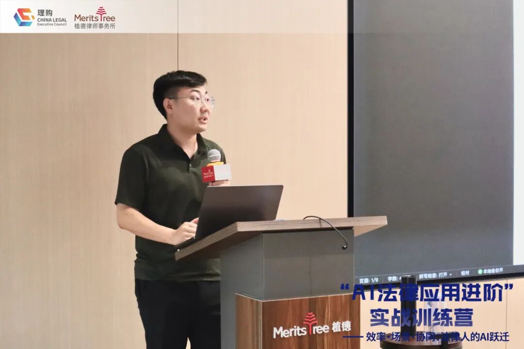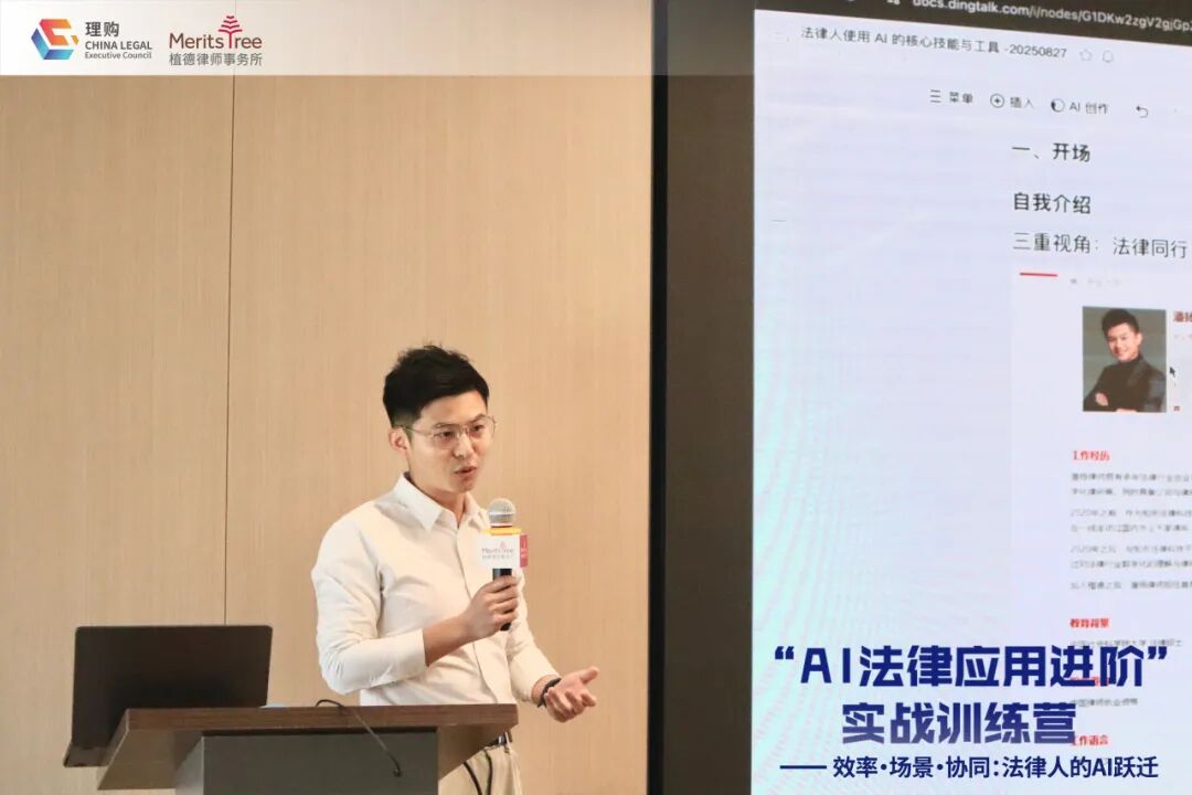 活动由北京植德律师事务所首席运营合伙人潘扬律师主讲。潘律师结合自身兼具律所管理者、法律科技创业者和企业经营者的独特经验,从法律人的AI认知、工具选择、提示词工程到系统化赋能,全面解析了企业法务在AI应用中面临的痛点及解决思路。